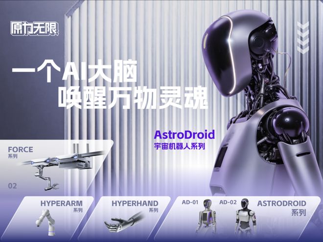 2025/10/132025年9月24日,杭州云栖大会,原力无限迎来了历史性的一刻——AstroDroid AD-01(宇宙机器人系列,型号:AD-01)全球首发。作为原力无限在具身智能领域的最新力作,AD-01的首秀是一次技术展示,更是「一个AI大脑,唤醒万物灵魂」的精彩演绎。来自各界的专家学者、政府领导及行业先锋齐聚一堂,见证了AstroDroid AD-01的重大亮相。